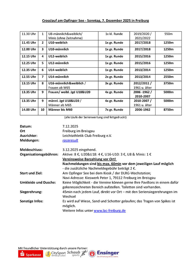 Der LAC Freiburg lädt Groß und Klein am Sonntag, 7.12.2025 zum Finale der Breisgauer Citysport Crosslaufserie 2025 am Opfinger See. Um 11:30 Uhr wird der erste Startschuss fallen, danach geht es in den verschiedenen Rennen nicht nur um den Tagessieg, sondern auch die Serienwertung.